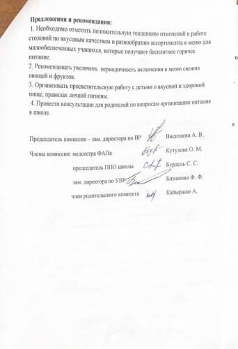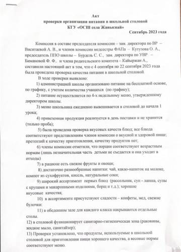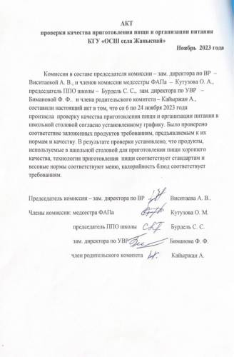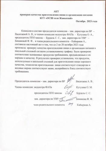 АКТ проверки качества приготовления пищи и организации питания КГУ "Осш села Жаныспай "